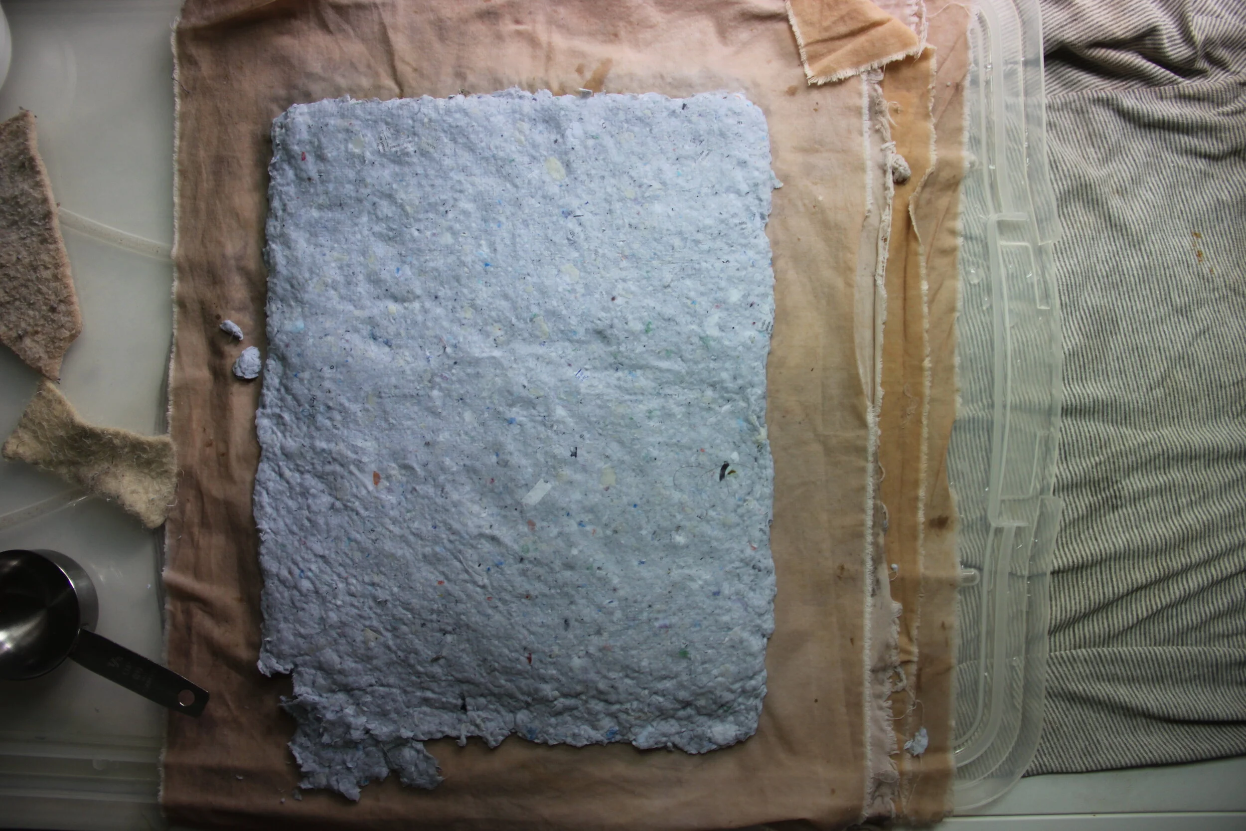 Recycled paper (see Recipe Card for more detail), recycled paper “backdrop” made during Calendars, Currencies and Curriculums, domestic items, digital photography, rainwater, dishwater